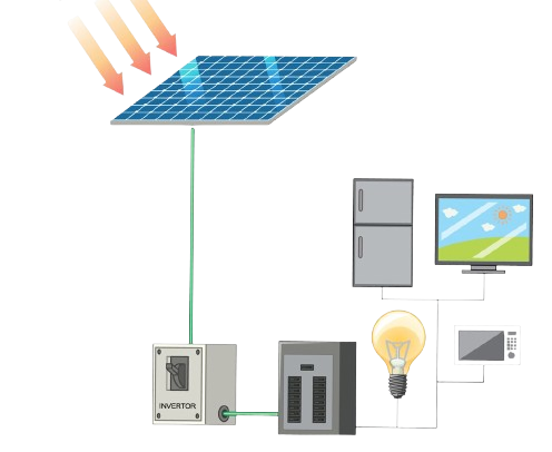 Once converted to AC, the electricity flows thru the electrical panel (breaker field) and is sent to power lights, home equipment, and other devices. Any surplus electricity can either be saved in solar batteries for later use or sent returned to the grid.